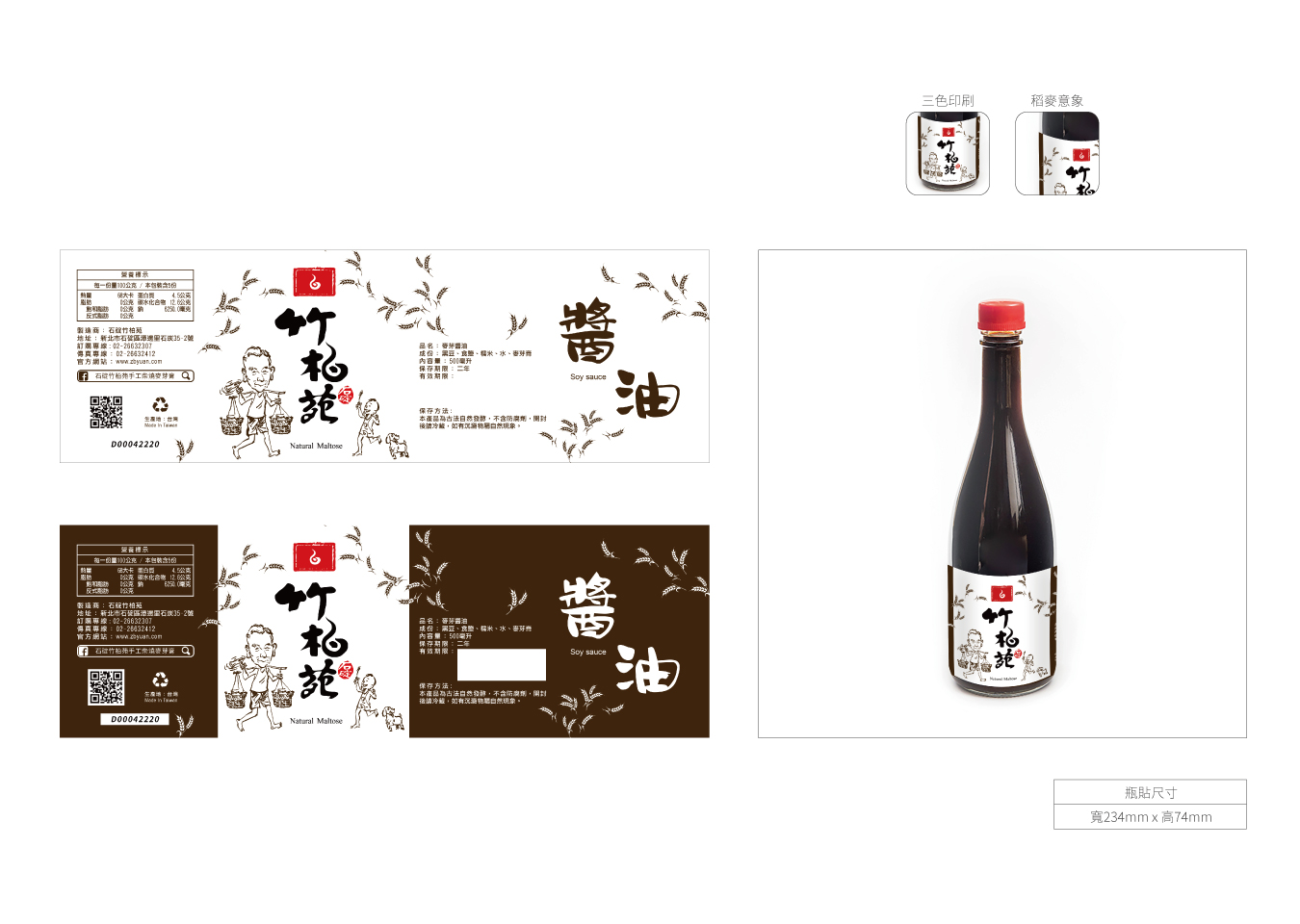石碇竹柏苑採用古法曝曬發酵釀造,取原汁加入麥芽熬煮而成,強調其獨特製成及念舊的情懷,因此和業主協調溝通後希望以稻麥和阿公為主要意象;顏色設計上採用醬油釀造產出的自然色澤。